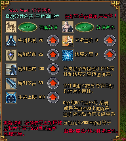 在原有分身功能上进行了更新具体内容请双击分身书进行查看。分身伤害与VIP等级有关。分身阶级对照群攻类别,1阶参照玩家100级群攻特效,以此类推。地爆天星为群攻的开关,学了才有群攻。群攻伤害= 群攻基础伤害(所带武器)+ 群攻基础伤害*0.3*VIP等级 最高可达到4倍伤害。分身合体为附加本体三维,计算方式为 5项加点总和/100*分身阶级,如10阶并且全加满就是 500/100*10=50,血量/魔法值/体力值全部增加50。